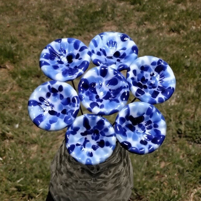 Blue and White Coral Disk Chinoiserie Currier Ives glass flower headpins, tiny small mini glass flowers on wire individual crafted lampwork