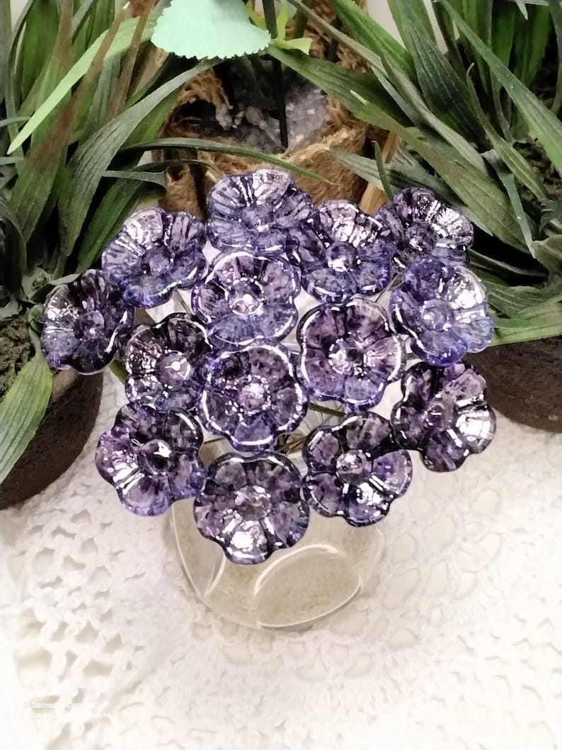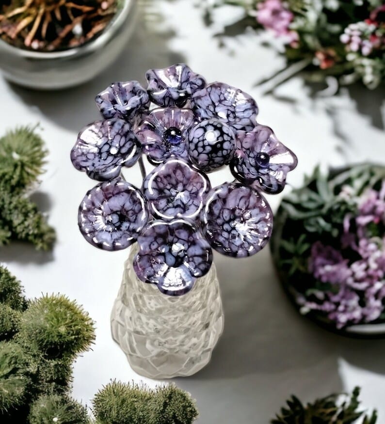 PURPLE MOTTLE JEWELTONE glass flowers on wire headpins; ~ miniature tiny small glass flowers on wire; individually crafted lampwork