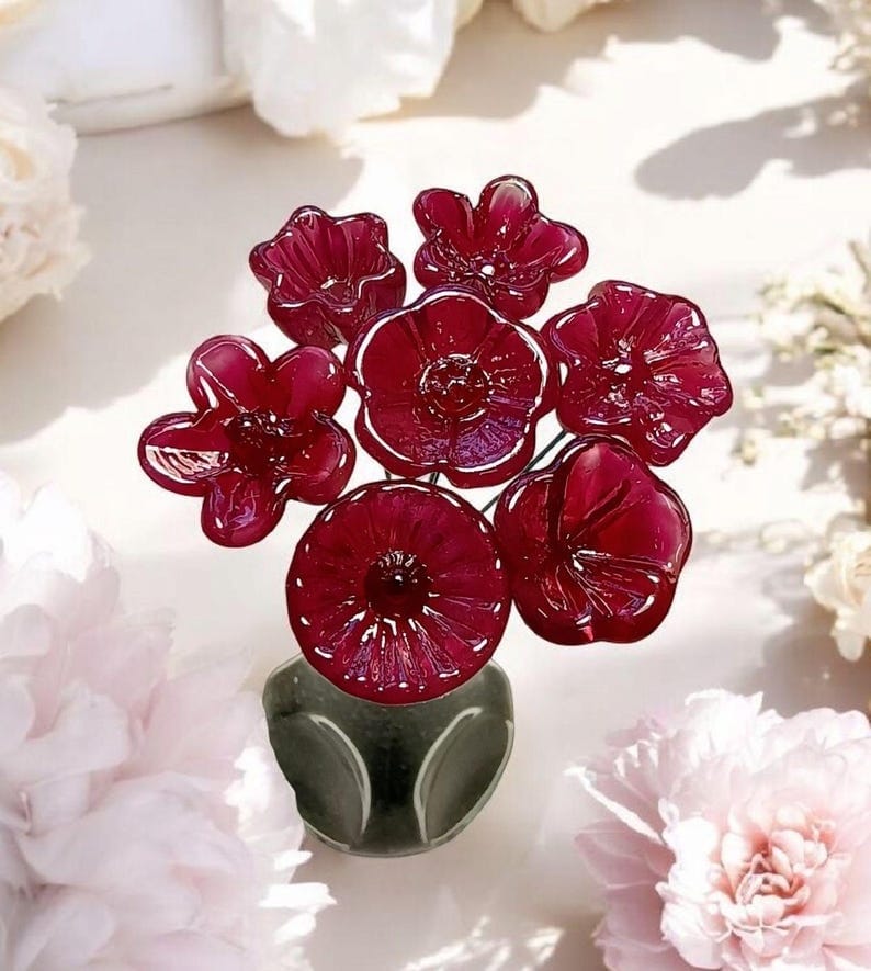 Cranberry Raspberry glass flowers ~ tiny small miniature glass flowers on wire; individually crafted lampwork glass flowers in my studio
