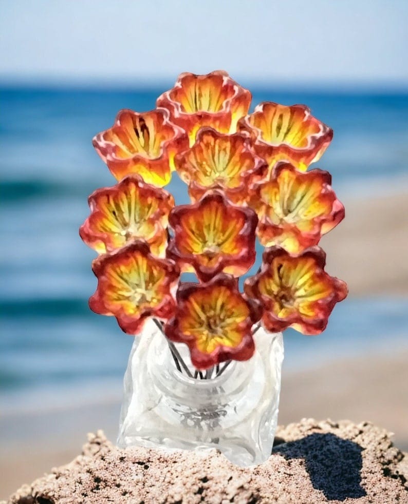 POPPY MIX Set/6 Red and Orange - glass flower headpins small tiny miniature glass flowers on wire, individually crafted lampwork bestseller
