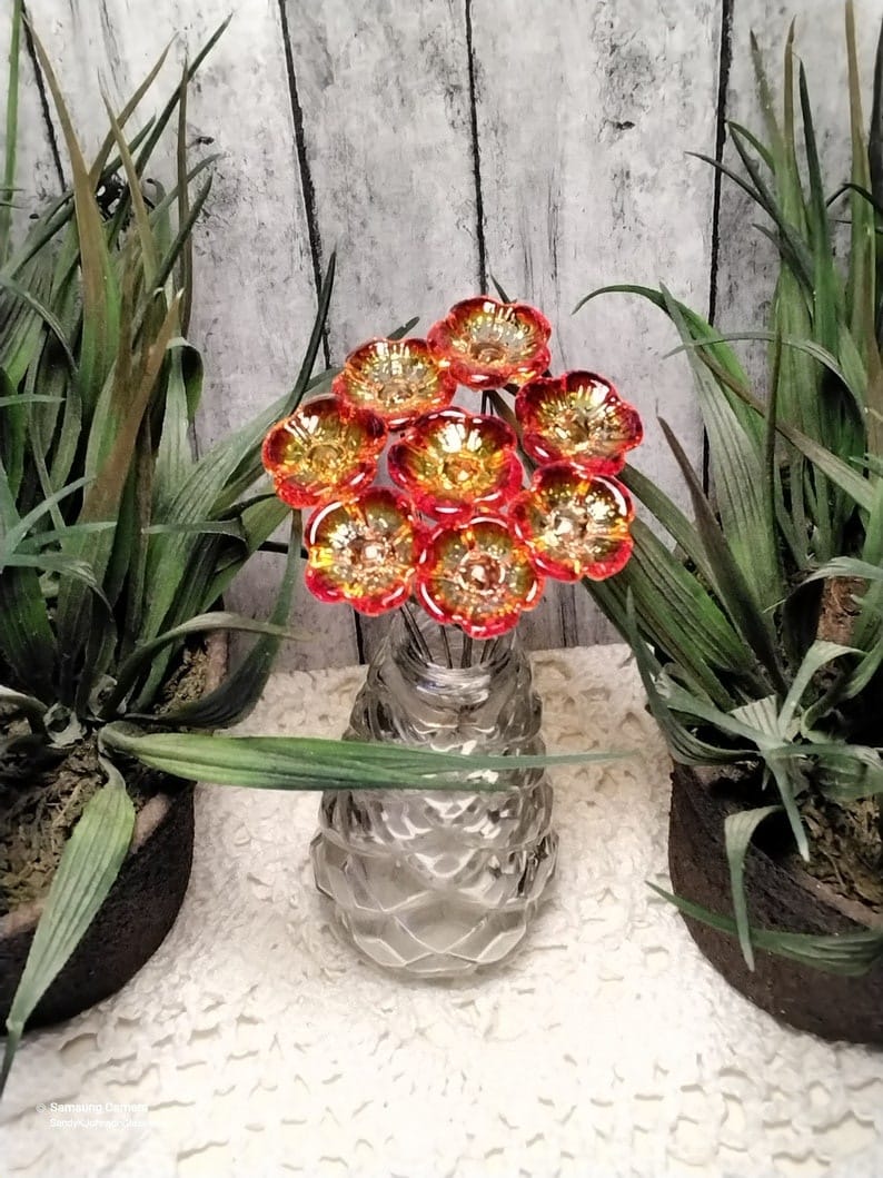 FIRE 5-Petal glass flower on wire headpins ~ miniature, tiny, small glass flowers on wire; individually crafted lampwork, uv glows!