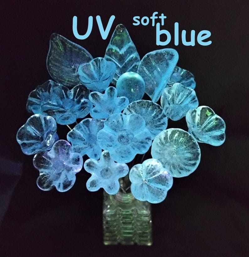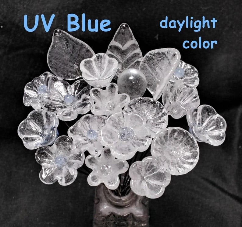New! SOFT BLUE GLOW uv reactive glass flowers; miniature tiny small glass flowers on wire; individually crafted lampwork; soft blue glow