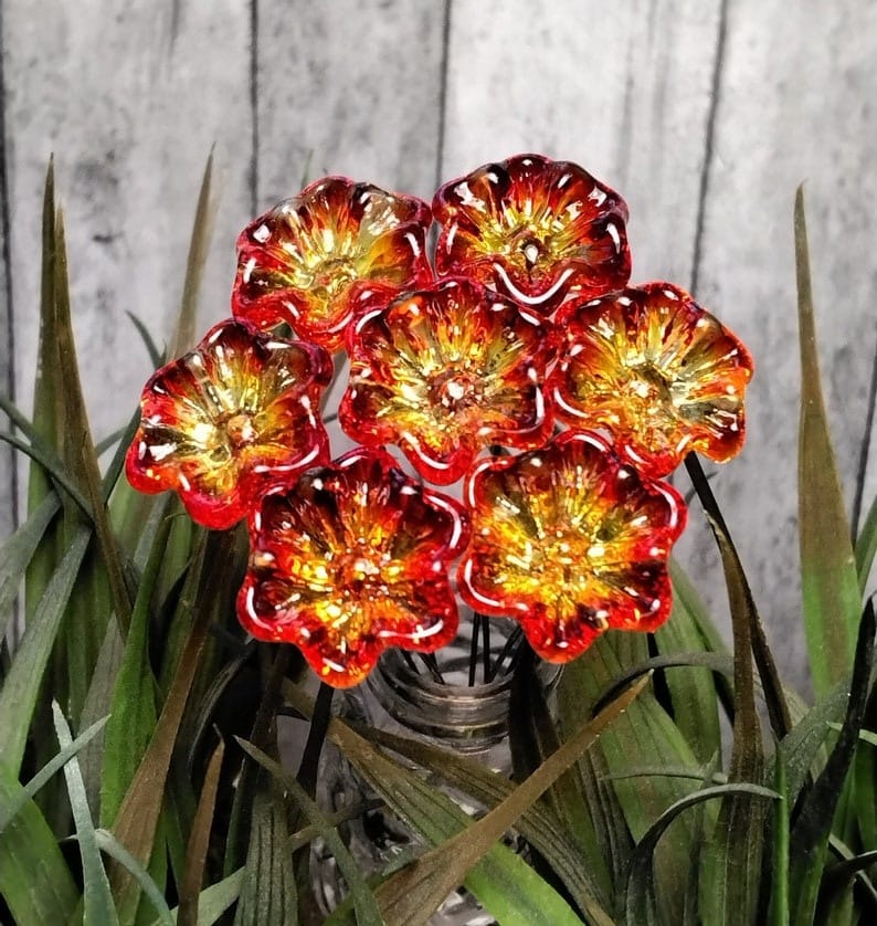 RED EMBERS Opaque UV Reactive - glass flowers on wire miniature small tiny (1/2" diameter) glass flowers; individually crafted lampwork
