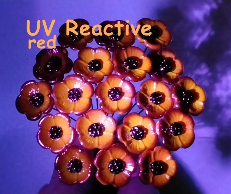 FIRE UV Reactive translucent ~glass flower miniature tiny small glass flowers on wire headpins; individually crafted lampwork; amber/red UV
